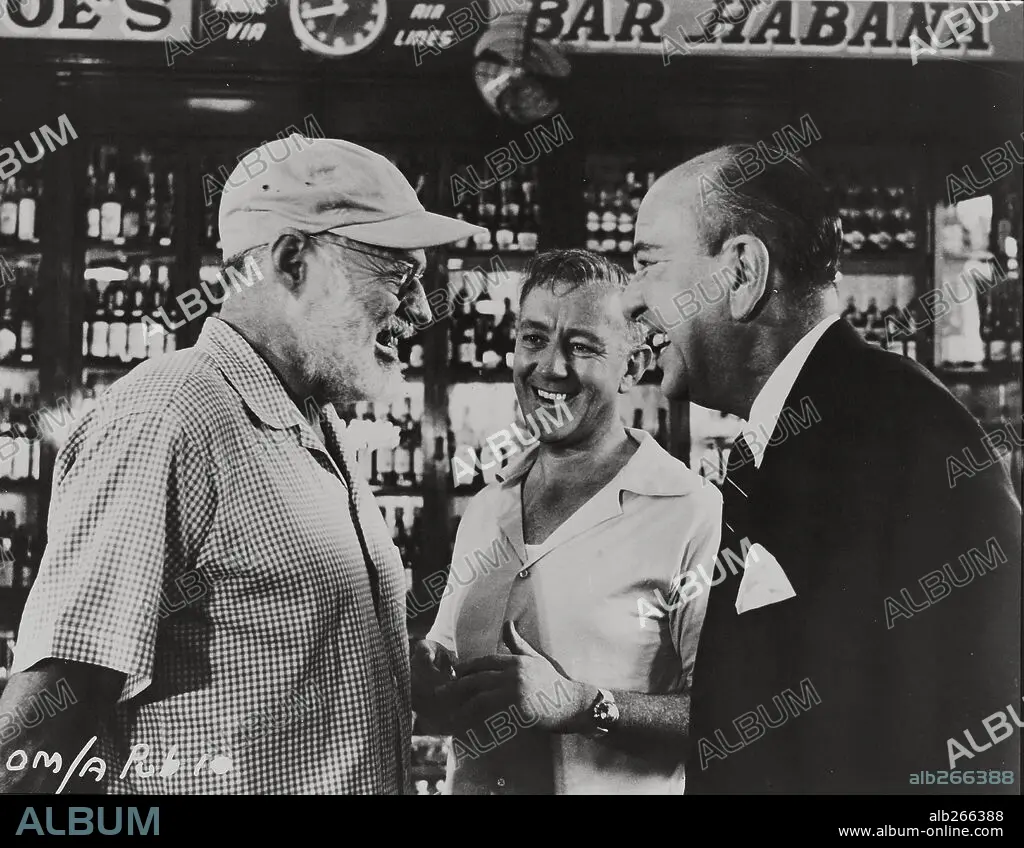 ERNEST HEMINGWAY, NOEL COWARD y SIR ALEC GUINNESS. ALEC GUINNESS, ERNEST HEMINGWAY y NOEL COWARD en NUESTRO HOMBRE EN LA HABANA (OUR MAN IN HAVANA, 1959), dirigida por CAROL REED. Copyright COLUMBIA PICTURES.