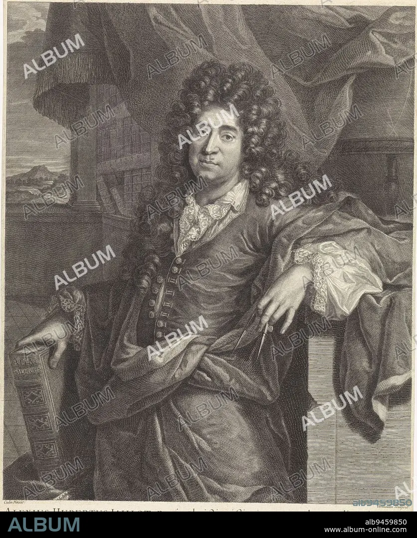 Portrait of Alexis Hubert Jaillot, Cornelis Martinus Vermeulen, after J. Culin, 1698, The French cartographer Alexis Hubert Jaillot. In one hand an atlas and in the other a compass., print maker: Cornelis Martinus Vermeulen, (mentioned on object), after: J. Culin, (mentioned on object), Antwerp, 1698, paper, engraving, h 398 mm × w 304 mm