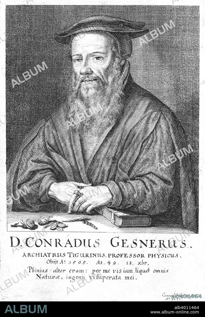 Conrad Gesner, 16th century Swiss physician and naturalist,[1662]. Gesner (1516-1565) practiced in Zurich until he died of plague. Engraving by Conrad Meyer (1618-1689) from a series of portraits of fellow citizens of Zurich.