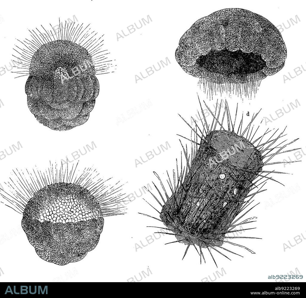 Development of Sycon raphanus, a species of marine invertebrate, a calcareous sponge belonging to the family Sycettidae, Historic, digitally restored reproduction from a 19th century original.