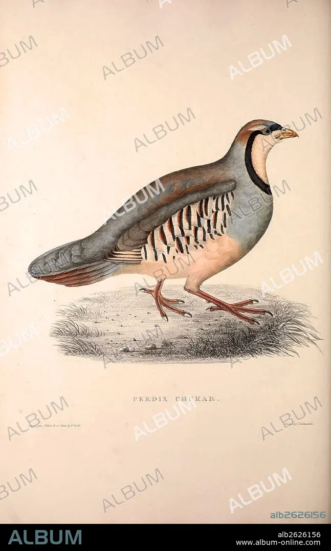 Perdix Chukar, Chukar Partridge. Eurasian upland gamebird in the pheasant family Phasianidae.. Birds from the Himalaya Mountains, engraving 1831 by Elizabeth Gould and John Gould. John Gould was working as a taxidermist,he was known as the 'bird-stuffer', by the Zoological Society. Gould's fascination with birds from the east began in the late 1820s when a collection of birds from the Himalayan mountains arrived at the Society's museum and Gould conceived the idea of publishing a volume of imperial folio sized hand-coloured lithographs of the eighty species, with figures of a hundred birds. Elizabeth Gould made the drawings and transferred them to the large lithographic stones. They are called Gould plates.