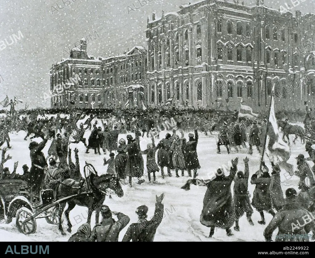 Descripción: GUERRA RUSO-JAPONESA (1904-1905). Japón entró en guerra con Rusia con la finalidad de asegurarse intereses capitales en Corea y sur de Manchuria. MANIFESTACION PATRIOTICA FRENTE AL PALACIO DE INVIERNO EN SAN PETERSBURGO. Grabado.