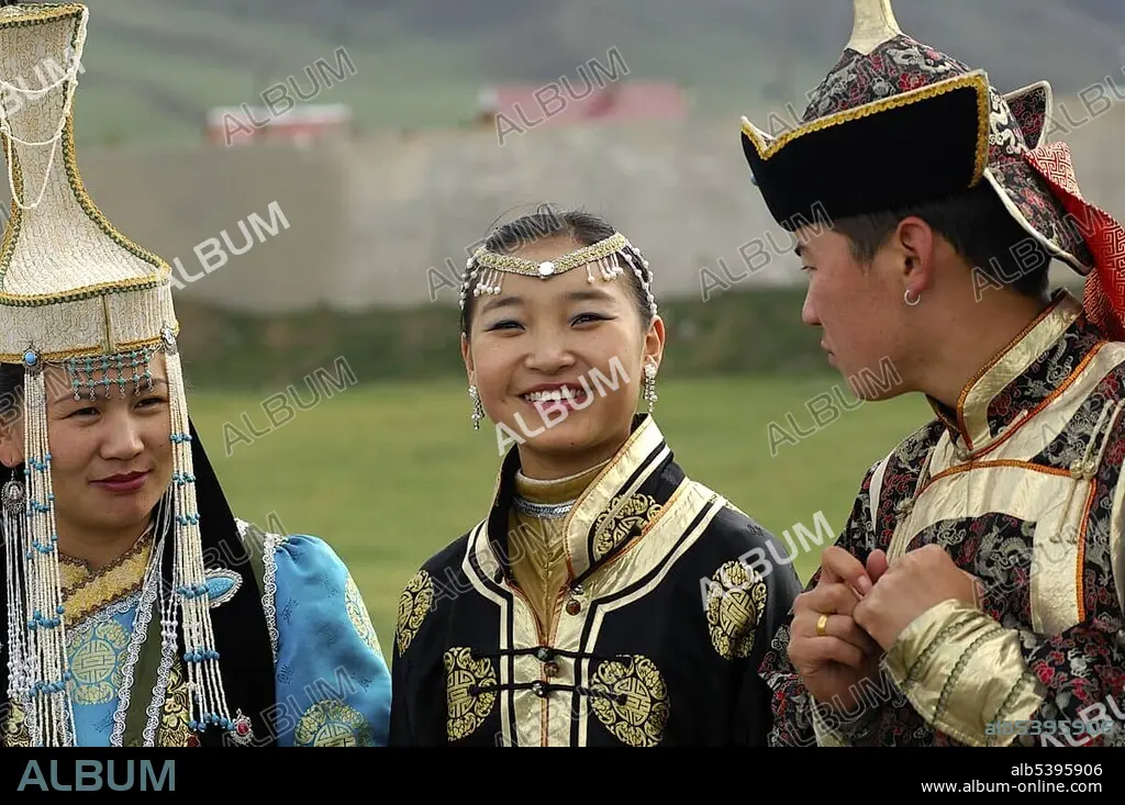 Two women and a man wearing traditional Mongolian national costumes, Ulan Bator or Ulaanbaatar, Mongolia, Asia.