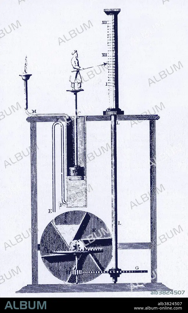 Water clock design by the Greek inventor and mathematician Ctesibius (285 - 222 BC). As water fills the cylinder, the figure rises, pointing to the time. The cylinder empties automatically to fill a drum that rotates the hour scale.