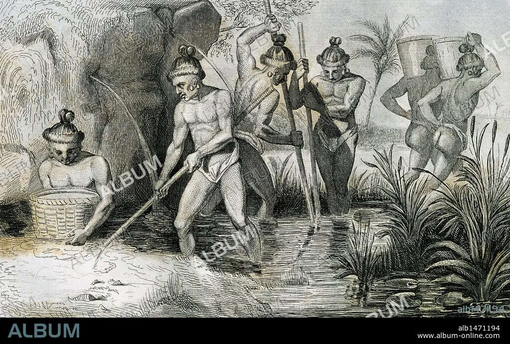 CONQUISTA ESPAÑOLA. AMERICA. SIGLO XVI. FLORIDA. "HABITANTES DE LA FLORIDA RECOGIENDO ORO" (en tiempos de la conquista). En 1512 Juan Ponce de León, conquistador y explorador español, descubrió la Península de la Florida y de la que tomó posesión en nombre de la Corona española. Grabado francés del año 1844. Dibujo de Demoraine y grabado por Taillant.