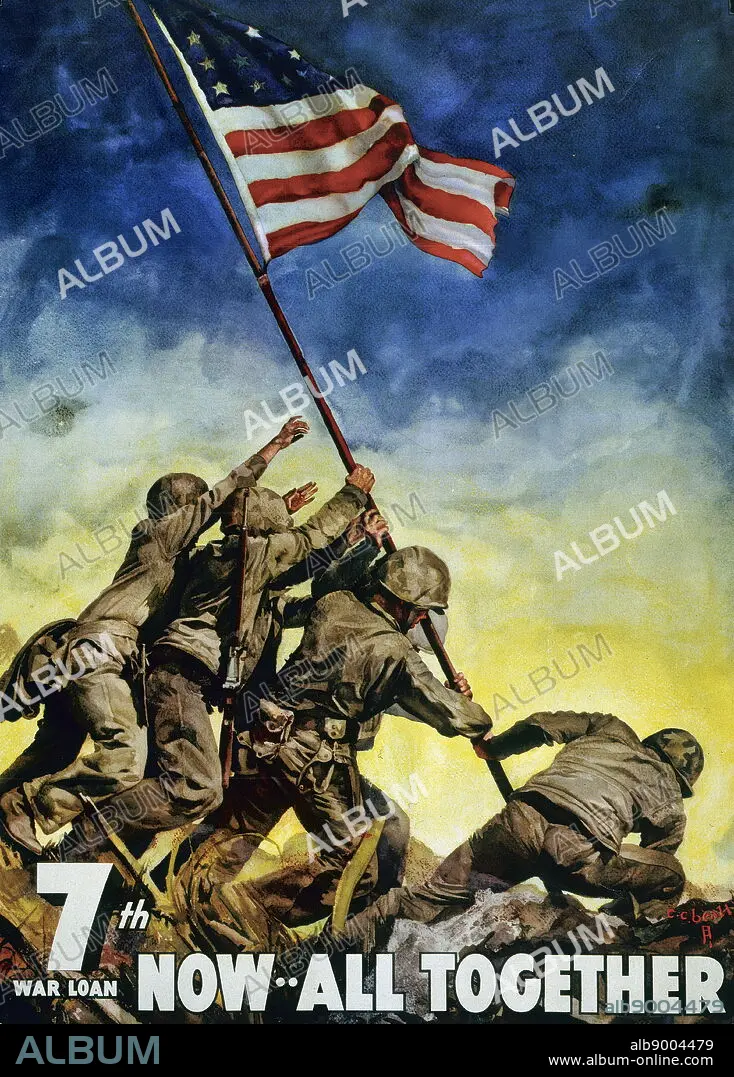 World War Two commemorative propaganda poster, showing U.S. Marines raising flag at Iwo Jima, during the advance on Japan in the Pacific war.