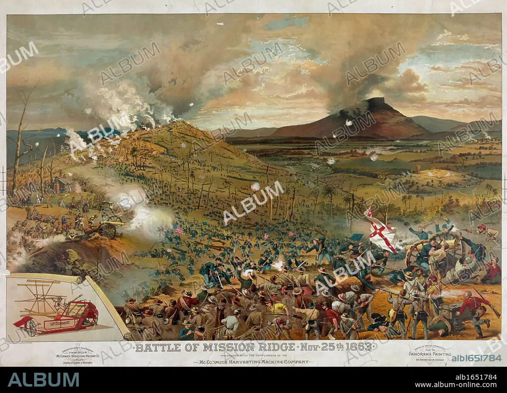 American Civil War 1861-1865. Chattanooga Campaign: Battle of Missionary Ridge, 25 November 1863. Union forces under Grant defeated Confederate army under Bragg. Print sponsored by McCormick Harvesting Co., 1886.
