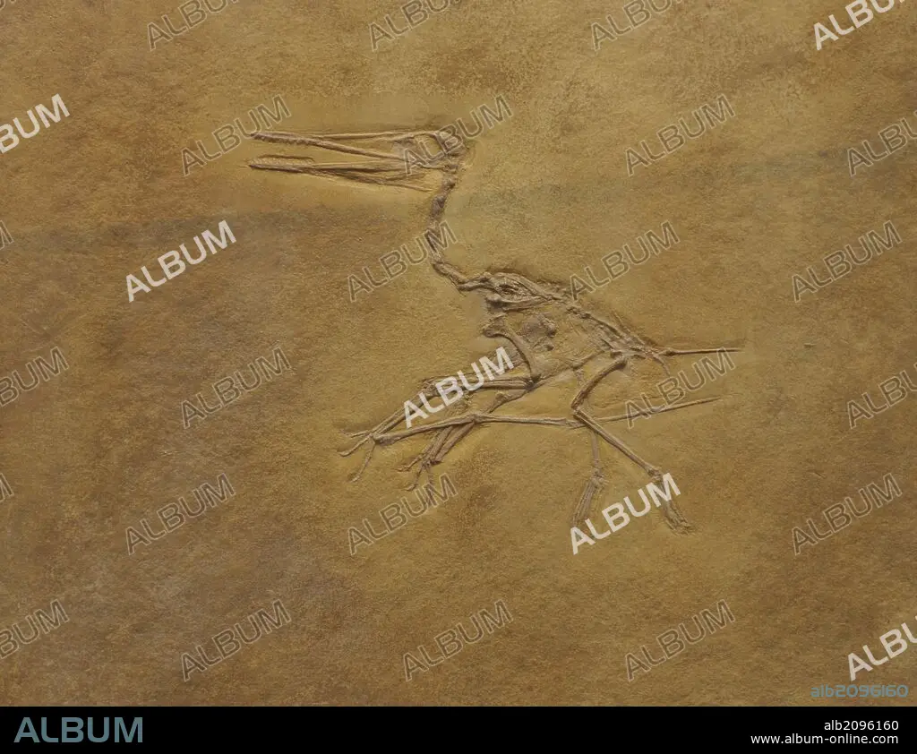 Pterodactylus, género de pterosaurio, cuyos miembros son popularmente conocidos como pterodáctilos. Período Jurásico, entre 150.8-148.5 millones de años. Carnívoro. Fosil de Pterodactylus kochi. Museum fur Naturkunde (Museo de Historia Natural). Berlín. Alemania. Europa.