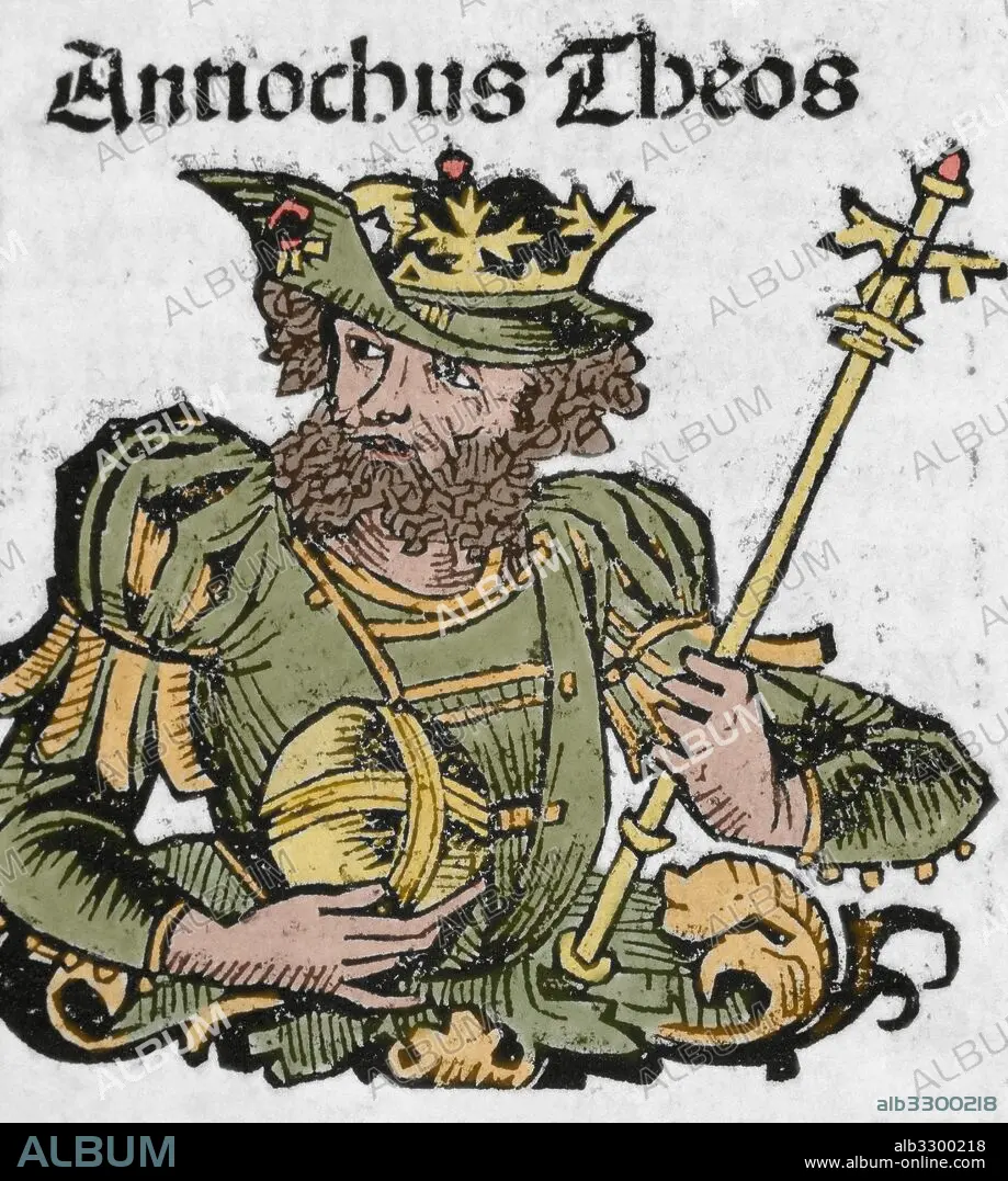 ANTIOCO II THEOS (en griego Antíochos Theós, "el Dios") (h.287 a.C-246 a.C.). Rey de la dinastía Seléucida (h.261-246 a.C). Fue desde 268 a.C. aproximadamente corregente del reino de Siria, con su padre Antíoco I, y rey desde la muerte de éste. Grabado del siglo XVI. Coloreado.