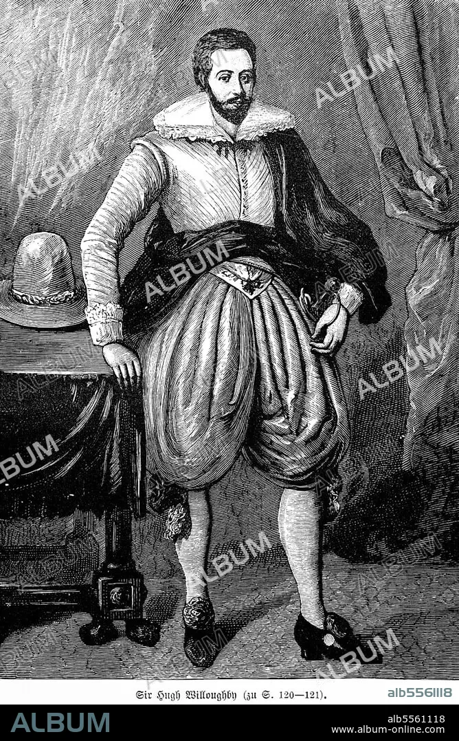Sir Hugh Willoughby, portrait, England, 16th century, Arctic, explorer, discoverer, famous, wealthy, robe, noble, furniture, historical illustration 1885