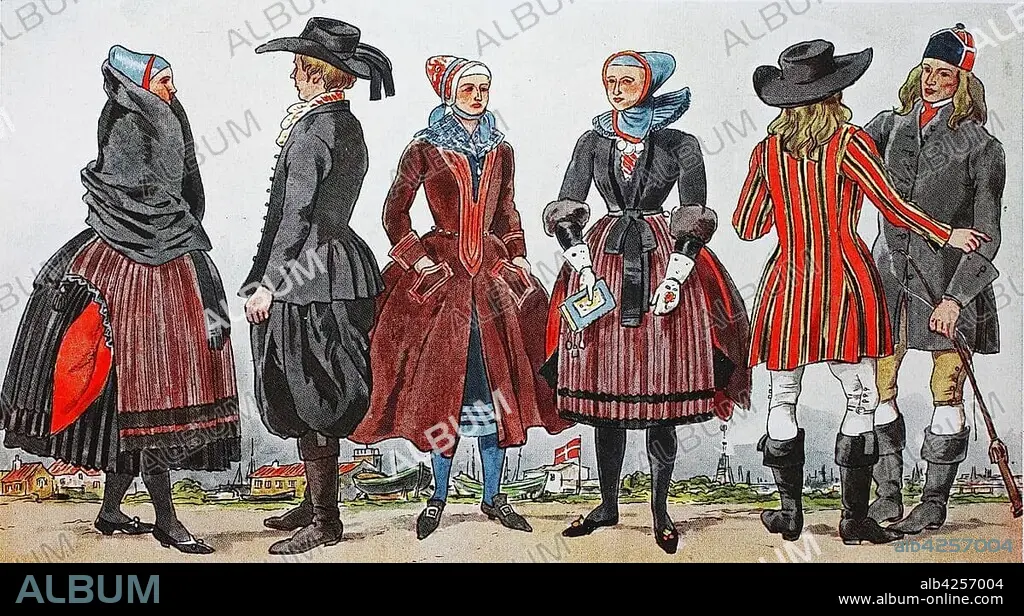 People in traditional costumes, fashion, clothes in Denmark, costumes around 1800, illustration, Denmark, Europe