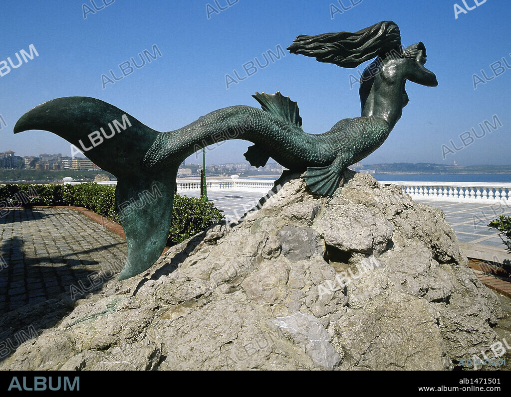 SIRENA. Ser fabuloso con busto de mujer y cuerpo de pez. Estatua de bronce en la Playa de La Magdalena. SANTANDER. Cantabria. España.