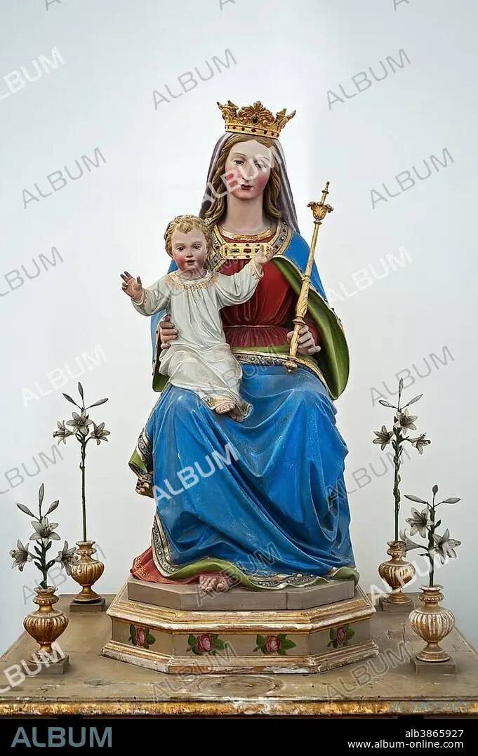 Virgin Mary holding baby Jesus with scepter and crown at the monastery Church of St. Peter and Paul in Weyarn, Upper Bavaria, Bavaria, Germany