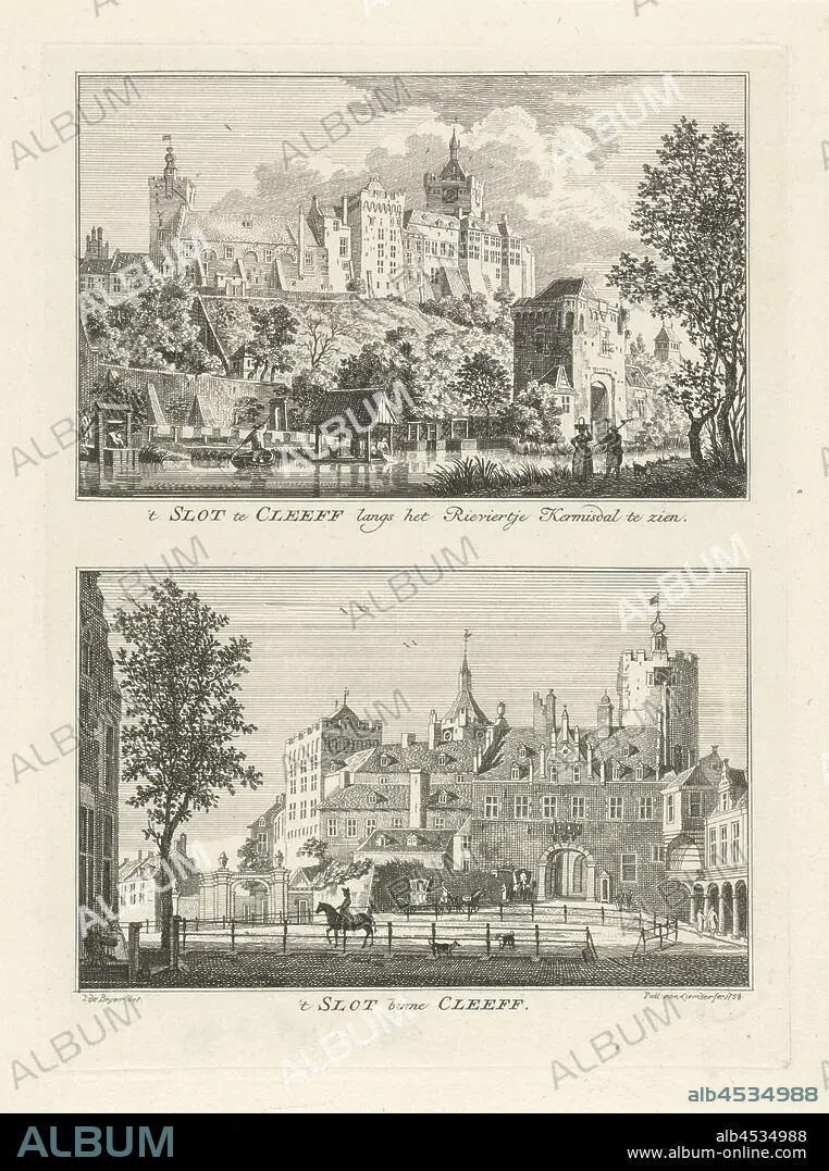 Schwanenburg in Kleef 't Slot in Cleeff along the Rieviertje Kermisdal on display /' t Slot in Cleeff (title on object) Town and city views in Kleve (series title), Two representations of one plate. Two views of Schwanenburg in Kleve, seen from the Kermisdahl (above) and from the city (below). The print is part of a 100-part series with views of villages and towns in Kleve, landscape with tower or castle, Zwanenburcht, Paulus van Liender (mentioned on object), 1758, paper, etching, h 201 mm × w 146 mm