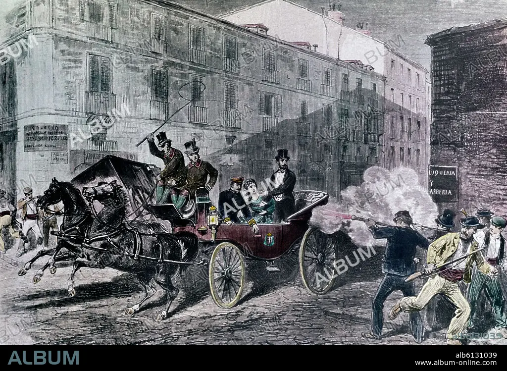 ATENTADO CONTRA AMADEO DE SABOYA Y SU ESPOSA EL 18 DE JULIO DE 1872 - LITOGRAFIA SIGLO XIX