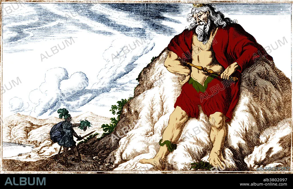 Colour enhanced illustration of Atlas and Perseus. According to Ovid, a giant named Atlas tried to drive a wandering Perseus from the place where the Atlas mountains now stand. Perseus revealed Medusa's head, turning Atlas to stone (those very mountains) when he tried to drive him away. In classical Greek mythology, Atlas was the primordial Titan who held up the celestial sphere. Illustration originally captioned: Perseus showing Atlas the head of Medusa, by Bauer (1703 edition). Colour