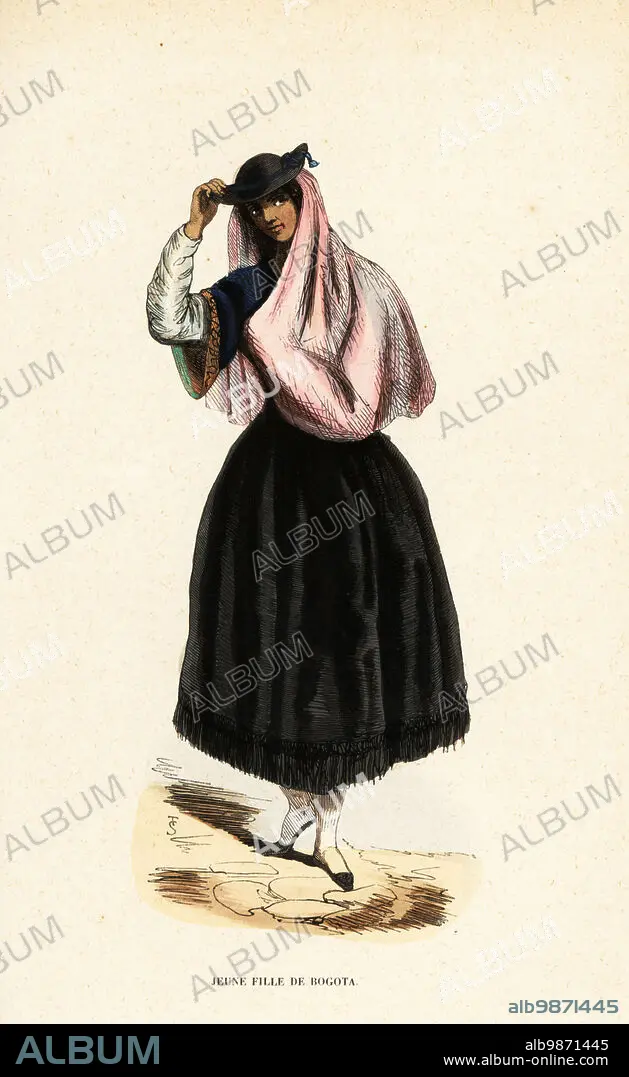 Young woman of Bogota, Colombia. She wears a black fringed saya (dress), fine mantilla shawl, and small black felt hat. Jeune fille de Bogota. Handcoloured woodcut by T.S. from Auguste Wahlen's Moeurs, Usages et Costumes de tous les Peuples du Monde, (Manners, Customs and Costumes of all the People of the World) Librairie Historique-Artistique, Brussels, 1845. Wahlen was the pseudonym of Jean-Francois-Nicolas Loumyer (1801-1875), a writer and archivist with the Heraldic Department of Belgium.