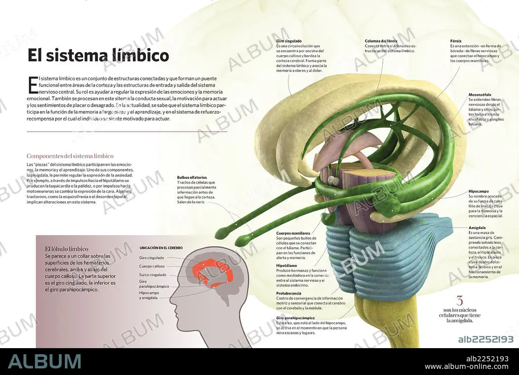 Descripción: Infografía del sistema límbico, el sistema compuesto por un conjunto de estructuras cuya función está relacionada con las respuestas emocionales, el aprendizaje y la memoria.