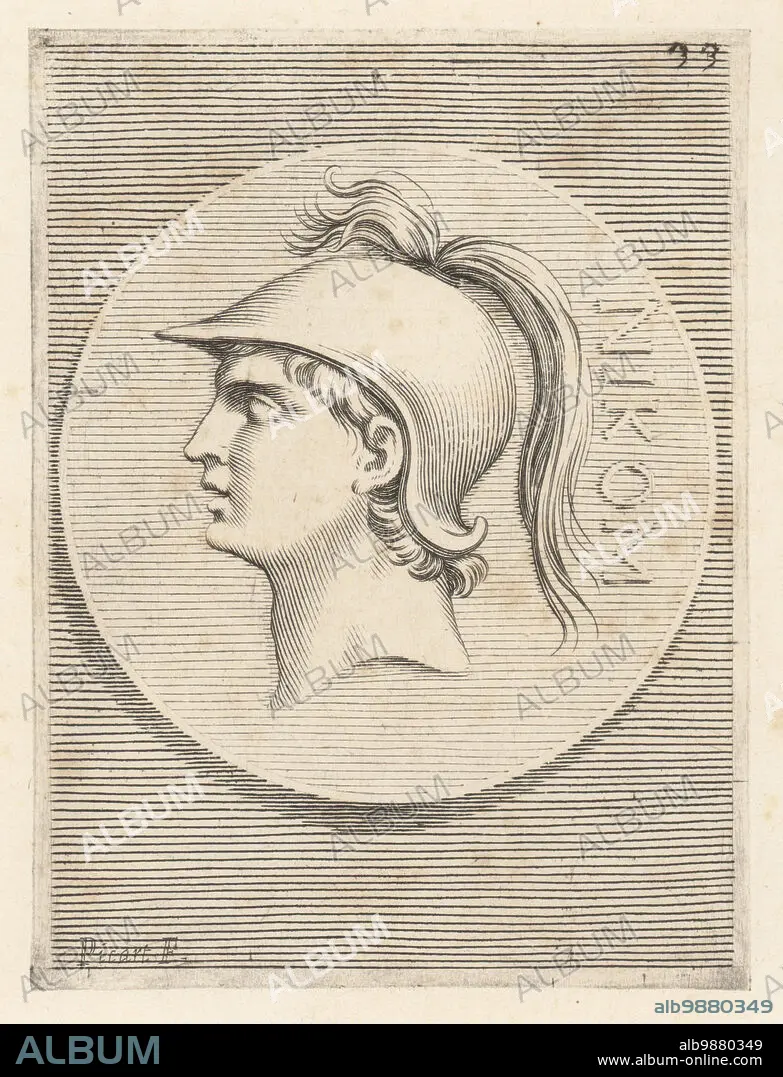 Nicomedes I, second king of Bithynia, eldest son of Zipoetes I, whom he succeeded on the throne, c. 300-255 BC. Nicomedes of Bithynia. Head of a young man in crested helmet from a bronze medal. Nikom. Copperplate engraving by Etienne Picart after Giovanni Angelo Canini from Iconografia, cioe disegni d'imagini de famosissimi monarchi, regi, filososi, poeti ed oratori dell' Antichita, Drawings of images of famous monarchs, kings, philosophers, poets and orators of Antiquity, Ignatio deLazari, Rome, 1699.