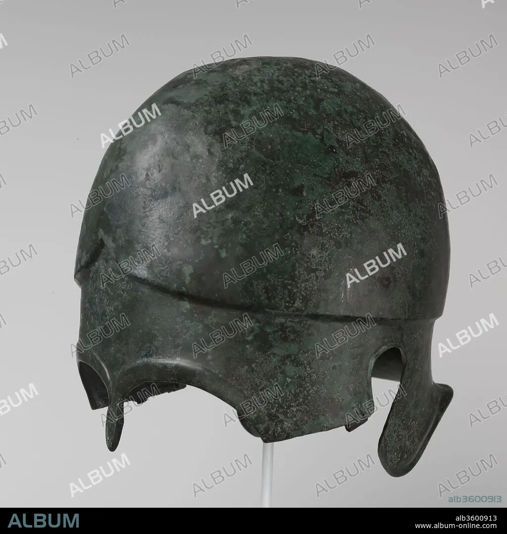 Traducción automática: Casco de bronce de tipo calcidio. Cultura: Griega. Dimensiones: H. 9 1/2 pulg. (24,1 cm) Ancho: 7 3/4 pulg. (19,7 cm) Profundidad 9 3/4 pulg. (24,8 cm). Fecha: 5ª-4ª siglo A.C. Este ejemplo representa una variante en la que las carrilleras están articuladas en lugar de una sola pieza continua.