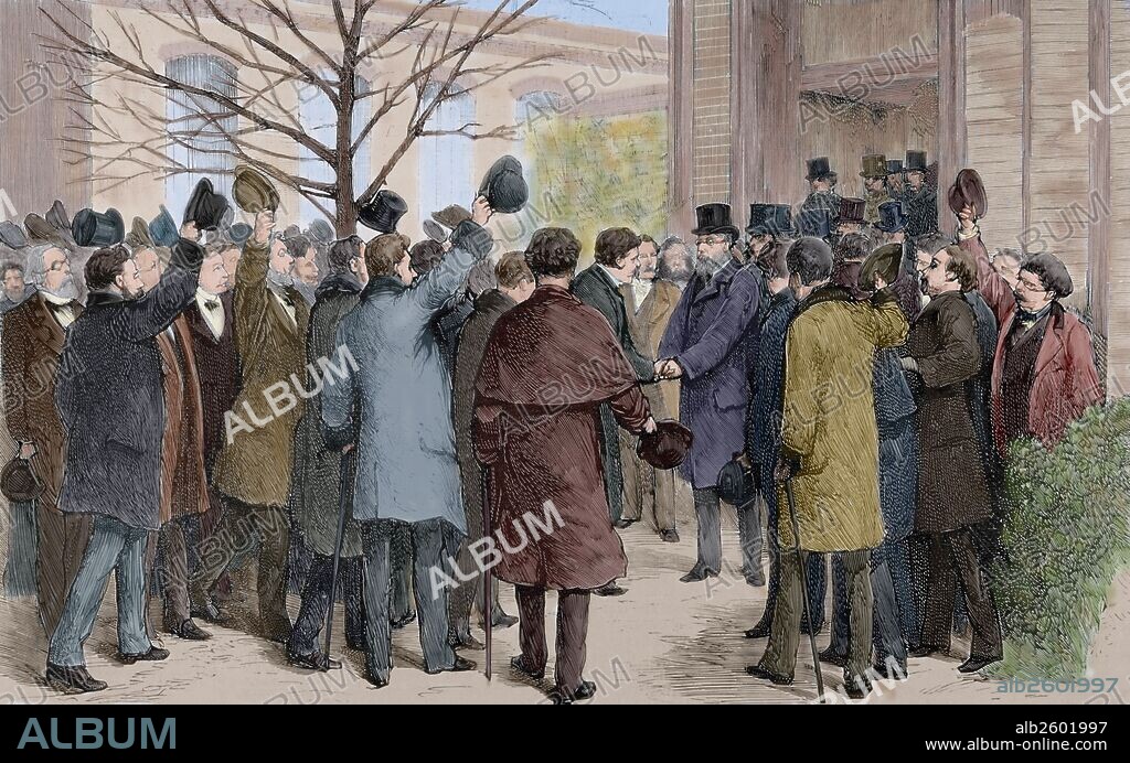 ROBERT KOCH (1843-1910). Médico alemán. Descubridor del bacilo de la tuberculosis y del cólera. Premio Nobel de Medicina en 1905. Considerado el fundador de la bacteriología. Grabado "Berlin: Ovación de los médicos alemanes y extranjeros al dr. Koch, al salir del real hospital". "La Ilustración Española y Americana", 1890. Coloreado.
