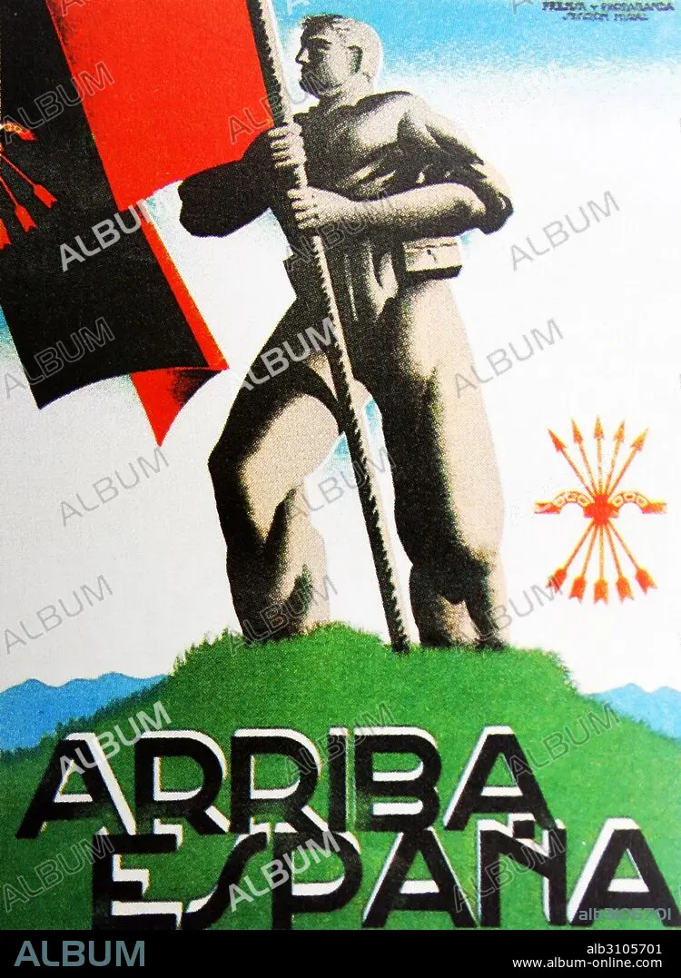 Spanish Polital propaganda poster: Arriba Espana Spain arise! published by the right wing Falange movement 1936. Shows a Falangist standing on hill top holding a flag with Falange symbol. Probably published at the outset of the Spanish Civil War.