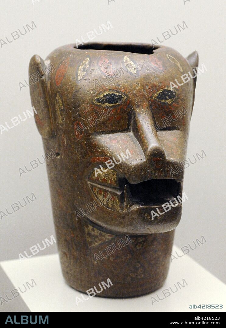 Vaso ceremonial representando una cabeza de jaguar. Madera policromada. Cultura Inca, Horizonte Tardío (1400-1533 d. C.). Cuzco, Perú. Museo de América. Madrid. España.