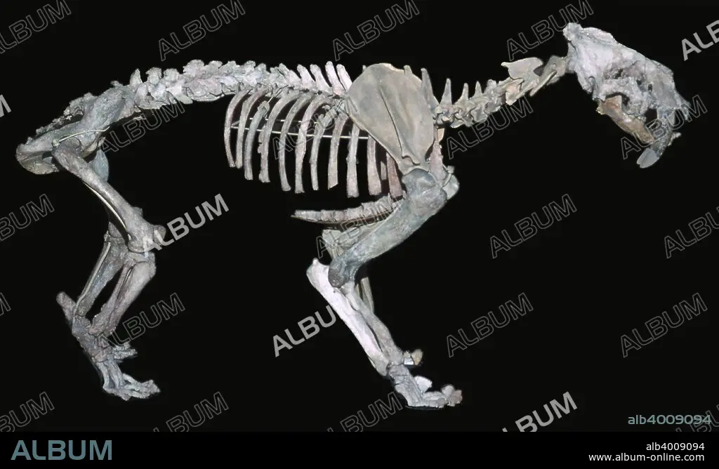 Fossil skeleton of a sabre-toothed tiger (Smilodon Neogaeus Lund) from Rio Araco, Argentina.