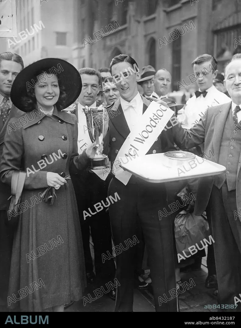USA NEW YORK CITY omkring 1930.. Joe Callin, kypare från Woodstock Hotel, tar emot priset av Fay Marbe, amerikansk dansös, skådespelare och sångerska, efter att ha vunnit en löptävling för kypare i New York City. Foto: Underwood & Underwood / AB Text & Bilder / SVT / Kod: 5600. Engelsk originalbildtext.. Mapp: Sportkuriosa Kypartävling -1935 3563A. Servitörer Vinnare Segrare Priser Pokaler