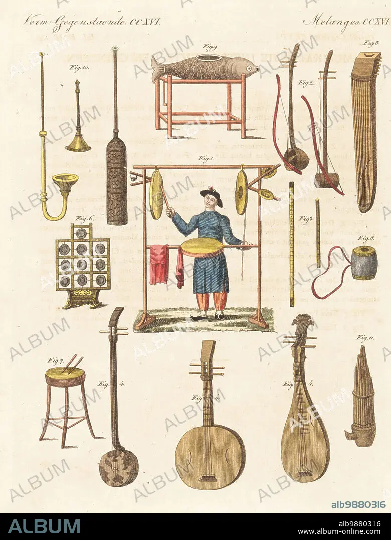 Chinese musical instruments, Qing dynasty.. Chinese female musician playing percussion 1, two-string Erhu (violin) 2, flutes 3, three-string guickin and four-string Pipa (guitars) 4, seven-string zither Tsen or Zheng 5, Hien-lo gongs 6, drum 7, drum 8, wooden fish drum 9, various trumpets 10, and bamboo reed instrument Sing or Sheng 11. Copied from an illustration by Antoine Cardon in Jean Baptiste Joseph Breton's La Chine en miniature, 1811. Handcoloured copperplate engraving from Carl Bertuch's Bilderbuch fur Kinder (Picture Book for Children), Weimar, 1815.