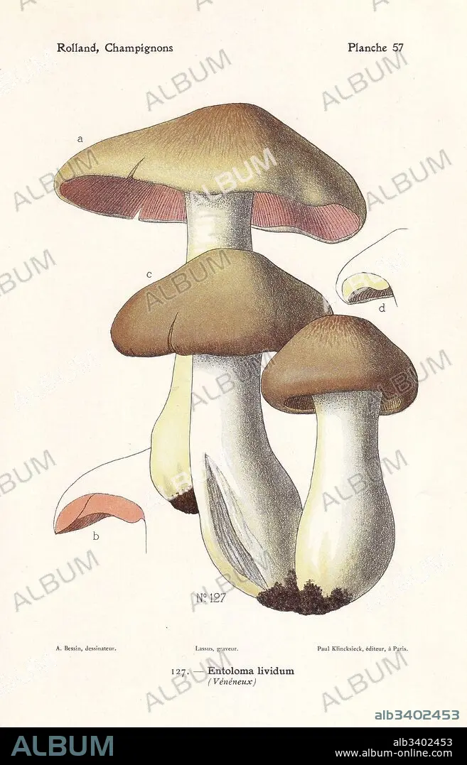 Livid entoloma or livid agaric, Entoloma sinuatum (Entoloma lividum). Chromolithograph by Lassus after an illustration by A. Bessin from Leon Rolland's Guide to Mushrooms from France, Switzerland and Belgium, Atlas des Champignons, Paul Klincksieck, Paris, 1910.