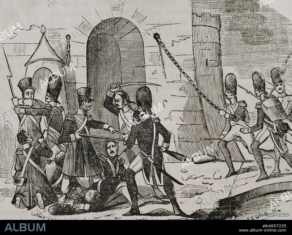España. Invasión Napoleónica. El general D'Armagnac hizo su entrada en Pamplona el 9 de febrero de 1808. Llegó como un aliado aunque con el objetivo oculto de tomar su ciudadela. Pretendió el general francés alojar a dos batallones en el interior de la ciudadela, siendo denegado el permiso por el Virrey de Navarra, Marqués de Villasantoro. Tras la negativa, el 15 de febrero, valiéndose de los soldados que cada día de madrugada acudían a la ciudadela a recoger el pan para la tropa y de un pequeño grupo de soldados escogidos, consiguieron apoderarse de la fortaleza con la ayuda tambien de dos compañias de granaderos. "Sorpresa de la Ciudadela de Pamplona". Grabado. Historia del Levantamiento, Guerra y Revolución de España, por el conde de Toreno,1851.