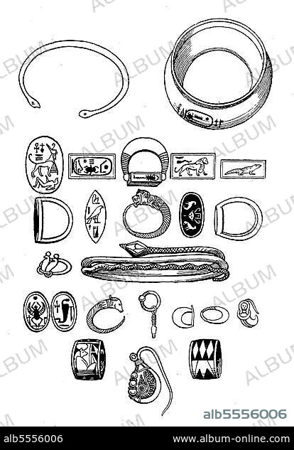 Altes Ägypten, Schmuck, Armbänder, Ringe, Ohrringe, 18. Dynastie, Geschichte der Mode, Historisch, digitale Reproduktion einer Originalvorlage aus dem 19. Jahrhundert