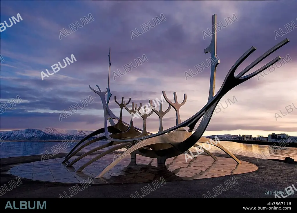 Sculpture Solfar or sun ride, The Sun Voyager by artist Jón Gunnar Arnason, Viking Ship made of stainless steel, Reykjavík, Iceland