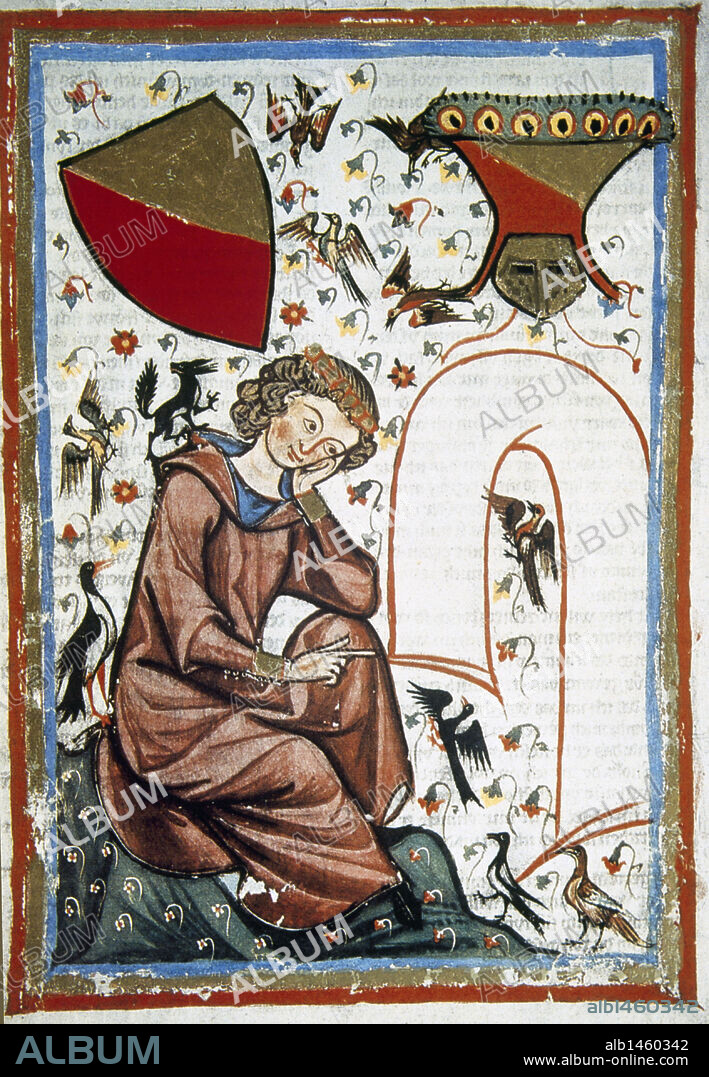 HEINRICH VON VELDEKE (h.1140/1150-antes de 1210). Poeta alemán considerado el fundador de la épica cortesana por su poema "Eneide" (Eneida), finalizada hacia 1184. Miniatura del CODICE MANESSE, realizado hacia 1300 por Rudiger Manesse y su hijo Johannes. Fol. 30r Biblioteca Universitaria. Heidelberg. Alemania.