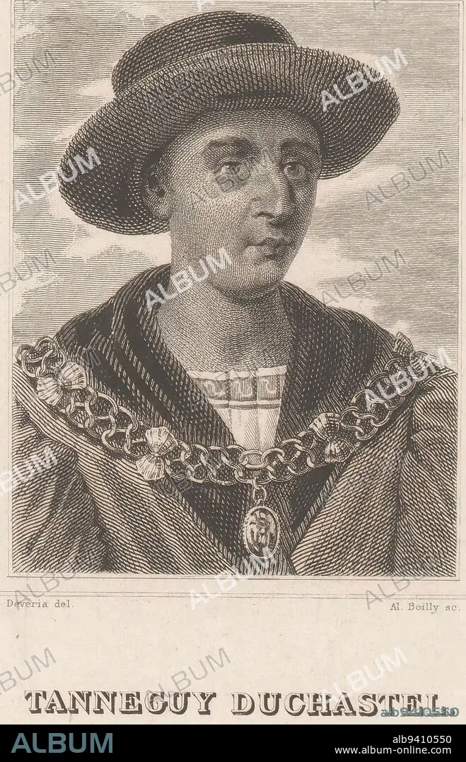 Portrait of Tanneguy III du Chastel, Alphonse Boilly, after Achille Devéria, after Eugène Devéria, 1811 - 1867, print maker: Alphonse Boilly, (mentioned on object), intermediary draughtsman: Achille Devéria, (mentioned on object), intermediary draughtsman: Eugène Devéria, (mentioned on object), France, 1811 - 1867, paper, etching, engraving, steel engraving, h 220 mm - w 145 mm.
