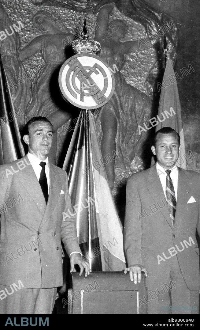 5 mayo 1954. Alfredo Di Stéfano y Roque Olsen Fueron objeto de un homenaje Tributado por el real Madrid y la Peña Olsen, Conjuntamente, en reconocimiento A la brillante actuación de ambos durante la campaña de Liga.Los dos Jugadores Aparecen ante las Banderas de España y Argentina y bajo el escudo del Club, Cuyos Colores Defienden en la Actualidad.