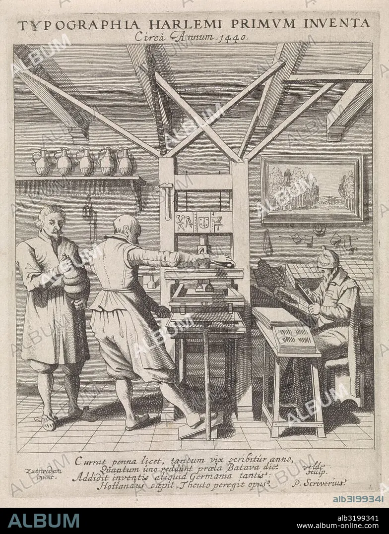 The invention of the printing press by Laurens Jansz. Coster, Haarlem, ca. 1440, interior of a book printer, with a printing press and putting letters, print maker: Jan van de Velde (mentioned on object), Dating 1628.