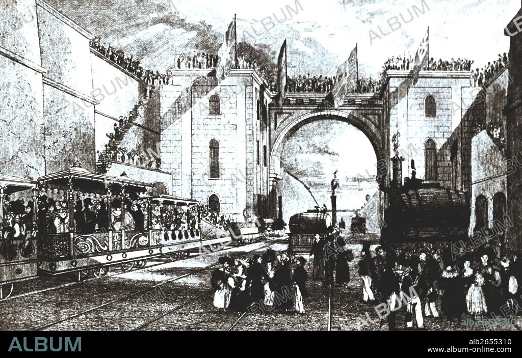 Descripción: Inauguración de la linea de Liverpool a Manchester, 15 septiembre 1830, con una máquina Rocket, primera línea ferrea del mundo. Grabado de la época.