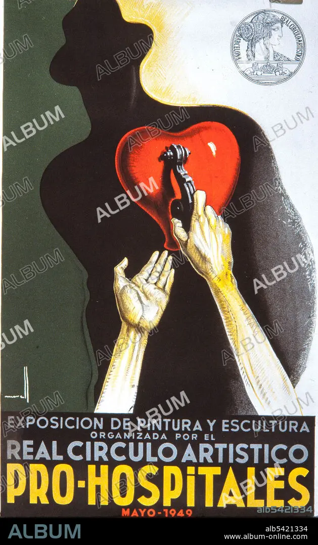 Descripción: Cartel de Josep Morell, 'Exposición de Pintura y Escultura, Organizada por el Real Círculo Artístico, Pro-Hospitales, mayo 1949'. Colección privada.