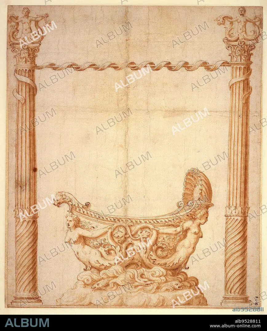 A ship-shaped bowl, supported by two mermaids, is surmounted upon a base representing the sea. The bowl is flanked by two high columns with mermaid finials connected to each other by a pole entwined with ribbon. Traces of framing lines are visible at the edges of the sketch. Pen and brown ink, brush and brown wash, black chalk on off-white laid paper. Date: 1533.