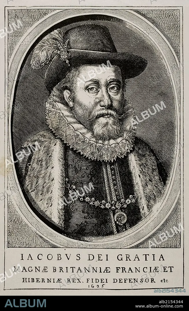 Jacobo Carlos Estuardo (1566-1625). Rey de Escocia como Jacobo VI desde el 24 de julio de 1567 hasta su muerte, y rey de Inglaterra e Irlanda como Jacobo I desde el 24 de marzo de 1603 hasta su muerte. Copia e un grabado de época.
