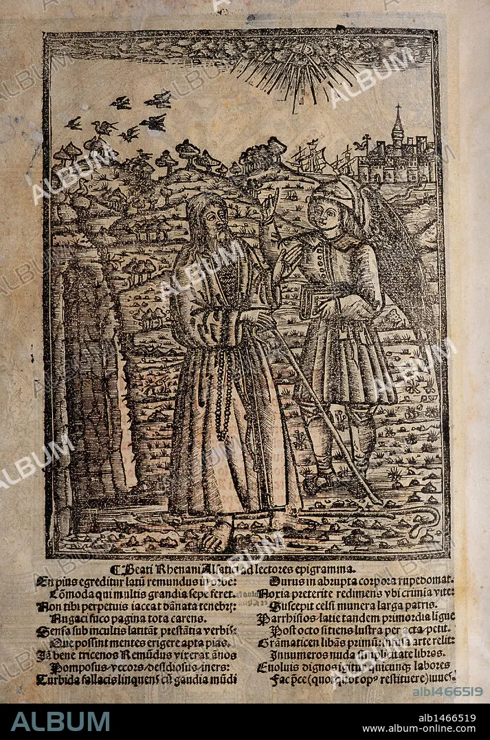 Descripción: LITERATURA CATALANA SIGLOS XIII Y XIV. LLULL, Ramon (Palma de Mallorca, 1233/35-Bujía, 1315/16). Filósofo, místico y literato mallorquín. "BLANQUERNA". Grabado de la contraportada, con Ramón LLull y un discípulo. "Beati Rhenani Alfatici ad lectores epigramma". Este folio, escrito en latín, quizá pertenece a otra obra. Biblioteca Bartomeu March. Palma de Mallorca. Islas Baleares. España.
