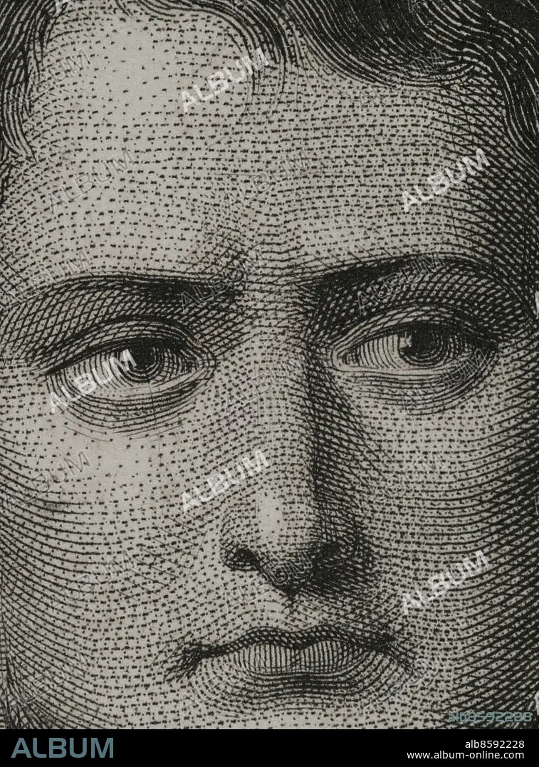 Napoleón I Bonaparte (1769-1821). Cónsul Vitalicio (1802) y Emperador de los franceses (1804-1815). Retrato. Grabado por Geoffroy. Detalle. "Historia Universal", por César Cantú. Tomo VI. 1857.