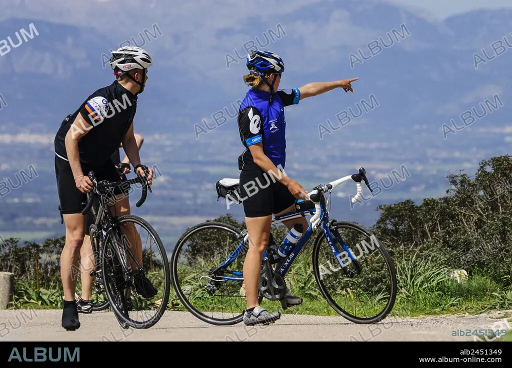 ciclistas en el Puig de Randa, cerro con una altura de 543 metros, Algaida, mallorca, islas baleares, españa, europa.