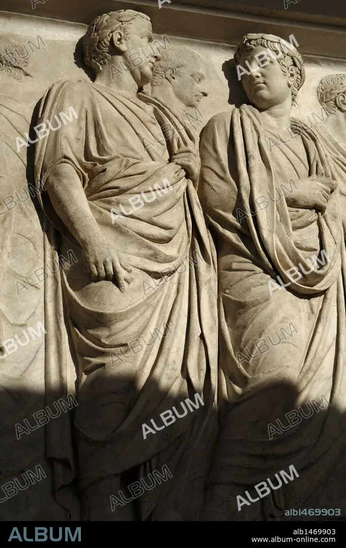 ARTE ROMANO. ITALIA. ARA PACIS AUGUSTAE. Altar levantado por Augusto para conmemorar el final de las luchas, dedicado a la diosa de la paz. Detalle del friso, donde aparecen representados a MAGISTRADOS CON TOGA. (13 a. C.). Campo de Marte. Roma. Europa.