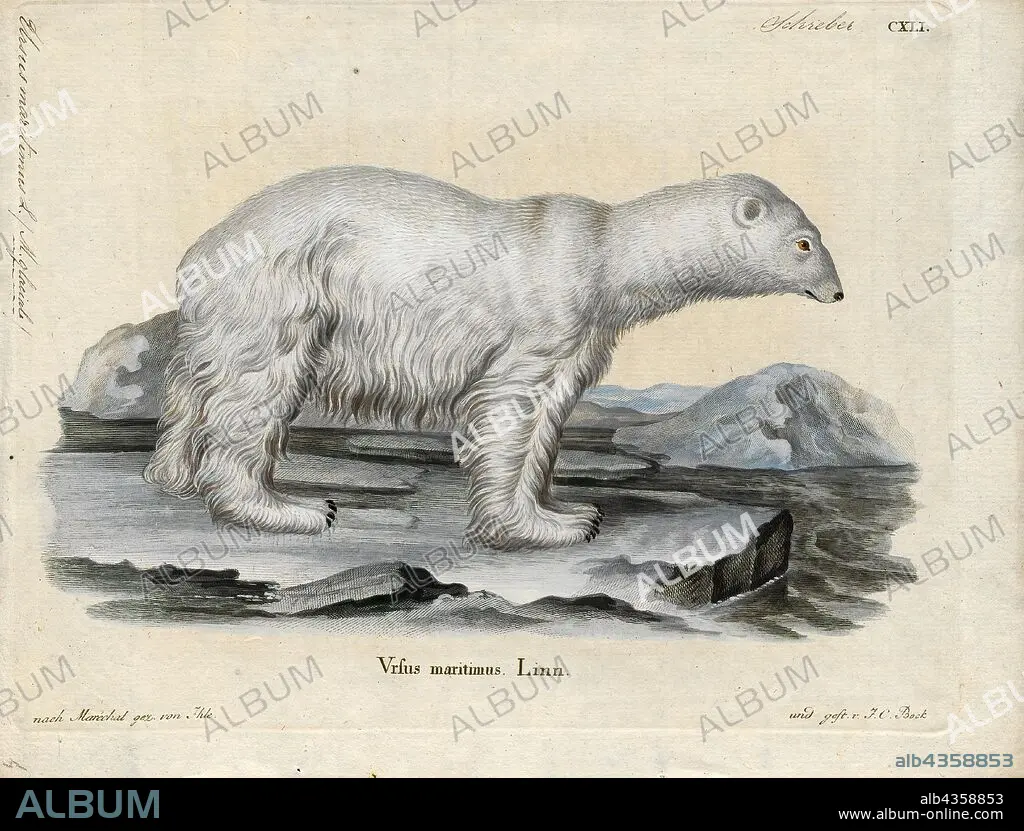 Ursus maritimus, Print, The polar bear (Ursus maritimus) is a hypercarnivorous bear whose native range lies largely within the Arctic Circle, encompassing the Arctic Ocean, its surrounding seas and surrounding land masses. It is a large bear, approximately the same size as the omnivorous Kodiak bear (Ursus arctos middendorffi). A boar (adult male) weighs around 350–700 kg (772–1, 543 lb), while a sow (adult female) is about half that size. Polar bears are the largest land carnivores currently in existence, rivaled only by the Kodiak bear. Although it is the sister species of the brown bear, it has evolved to occupy a narrower ecological niche, with many body characteristics adapted for cold temperatures, for moving across snow, ice and open water, and for hunting seals, which make up most of its diet. Although most polar bears are born on land, they spend most of their time on the sea ice. Their scientific name means "maritime bear" and derives from this fact. Polar bears hunt their preferred food of seals from the edge of sea ice, often living off fat reserves when no sea ice is present. Because of their dependence on the sea ice, polar bears are classified as marine mammals., 1700-1880