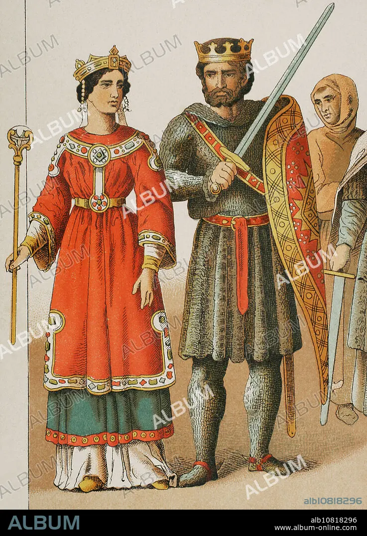 Historia de Francia, 1100. Reina, rey y hombre del pueblo. Cromolitografía. "Historia Universal", por César Cantú. Tomo V, 1884.