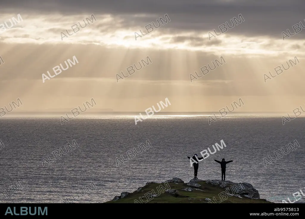 niños jugando al atardecer, Neist Point, isla de Skye, Highlands, Escocia, Reino Unido.
