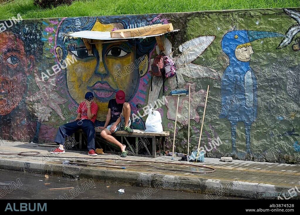 Young gang members sitting in front of graffiti wall, Comuna 8 slum, Medellin, Antioquia Department, Colombia